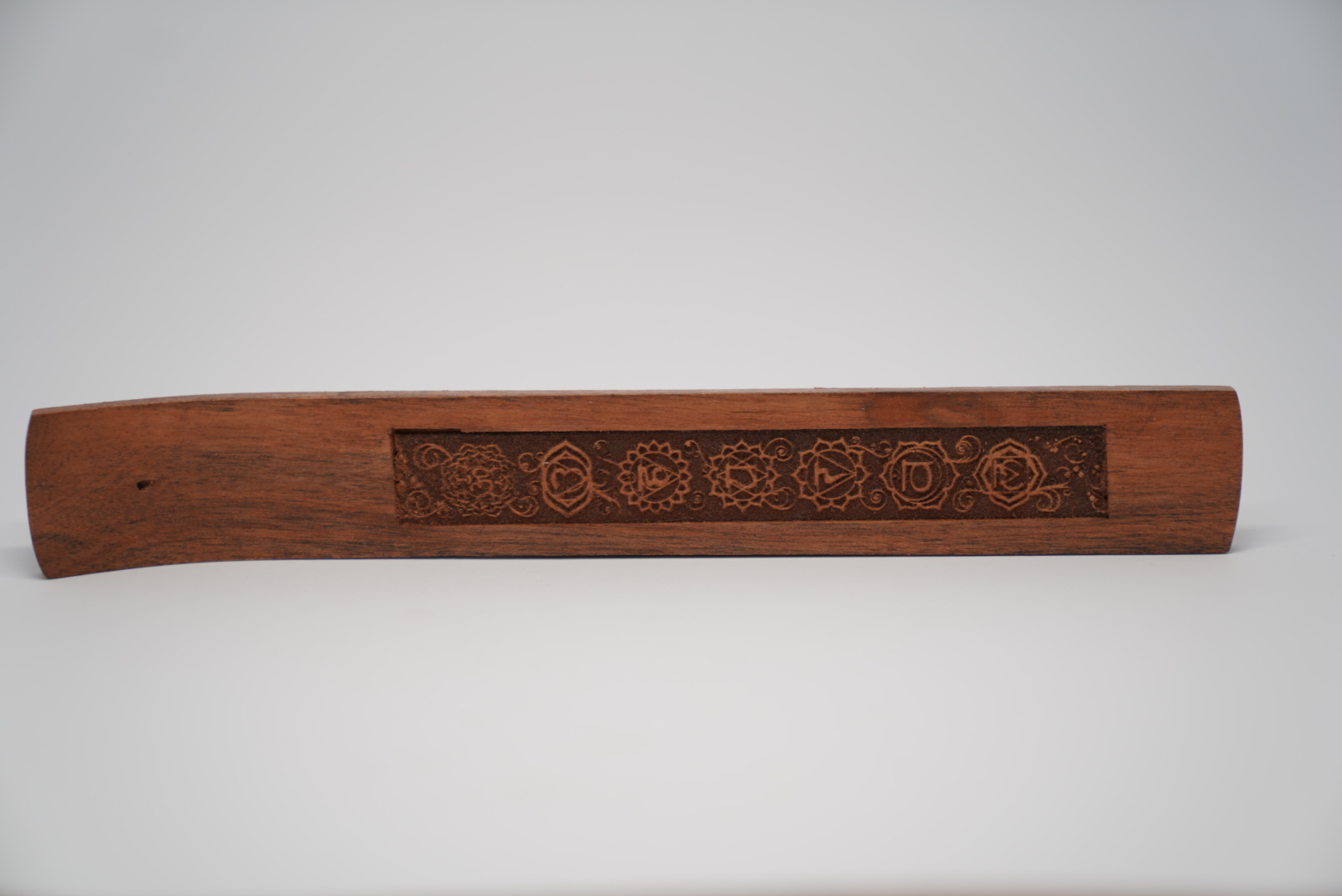 Balance für Körper, Geist & Seele: Dieser handgeschnitzte Räucherstäbchenhalter aus edlem Sheesham-Holz ist mit den sieben Chakren-Symbolen verziert – perfekt, um beim Räuchern Harmonie und Achtsamkeit zu fördern.